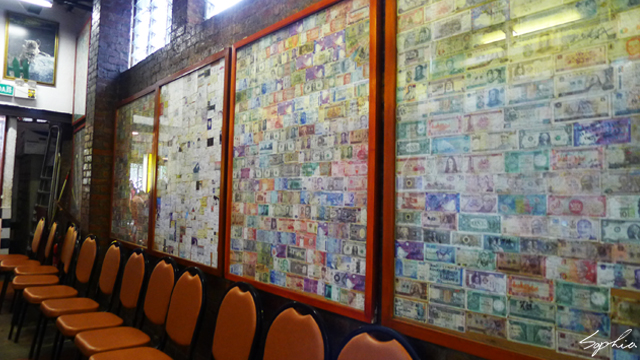 走經過長廊,牆壁上貼滿世界各國的紙鈔,上面有食客的簽名留言。