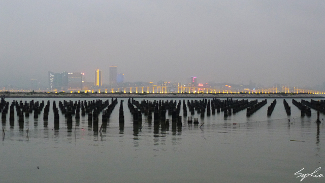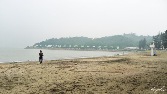 結束激烈的賽車活動(請按此),我們一行人離開賽車場,搭車來到下一個目的地「黑沙海灘」。黑沙海灘由於其黑色的砂粒而得名,只不過近年來因為黑沙慢慢減少,所以澳門當局鋪上黃沙以填補流失的沙灘。這黃色沙粒比較像是貝殼沙,走起來似乎會很扎腳。