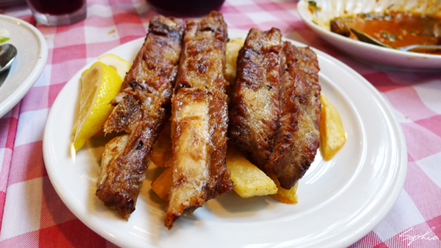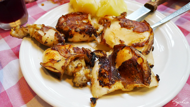 海鮮都上完了,現在開始進入肉食世界吧。首先上桌的是鹽燒排骨。這裡的排骨不像美式餐廳的排骨總是沾著膩口的BBQ醬汁,而只有抹上簡單的粗鹽去烤,淋上檸檬之後,口味更是清爽,口感也是非常不錯,很好吃。