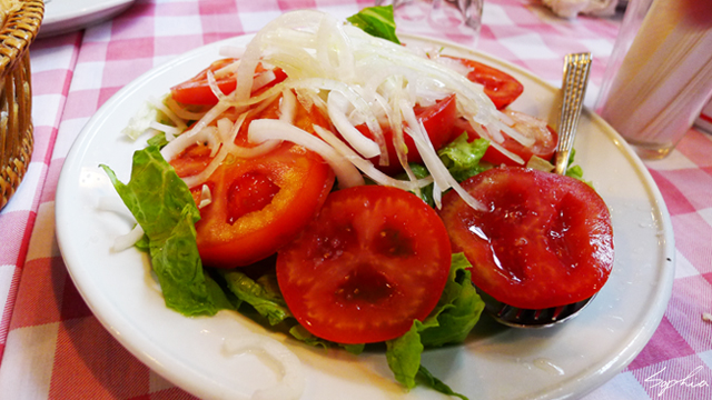 很簡單的沙拉,有羅曼生菜、洋蔥及番茄,配上簡單的醬汁非常好吃。尤其是鮮紅的番茄,緊實的果肉很好吃。