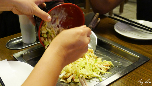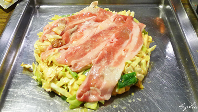 這裡的大阪燒每份85元港幣,每份大阪燒可以點6個點數的配料。比如說金針菇1點,泡菜2點,豬肉3點,這三項加起來是6點,就可以做成一份大阪燒。而大阪燒的口味有三種,分別是原味、咖哩、辣味。我們有四個人,所以決定點三分大阪燒,每一種口味各點一個。