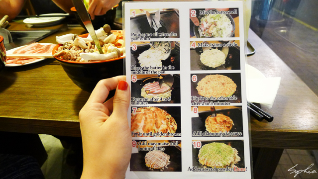 這裡還有一張分解圖教你如何做大阪燒。那我們就依照上面的指示一步一步做吧!