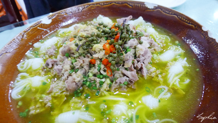 酸湯肥牛跟我想像的有點不一樣,不知為啥湯上面浮了一層黃色的油,有點像是咖哩的顏色的感覺。天氣很冷,這道菜端上來雖然冒著熱氣,吃到嘴裡卻一點都不燙口,讓我挺失望的。我想要的是熱騰騰的湯汁啊。