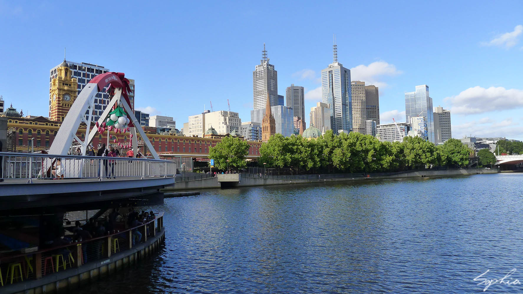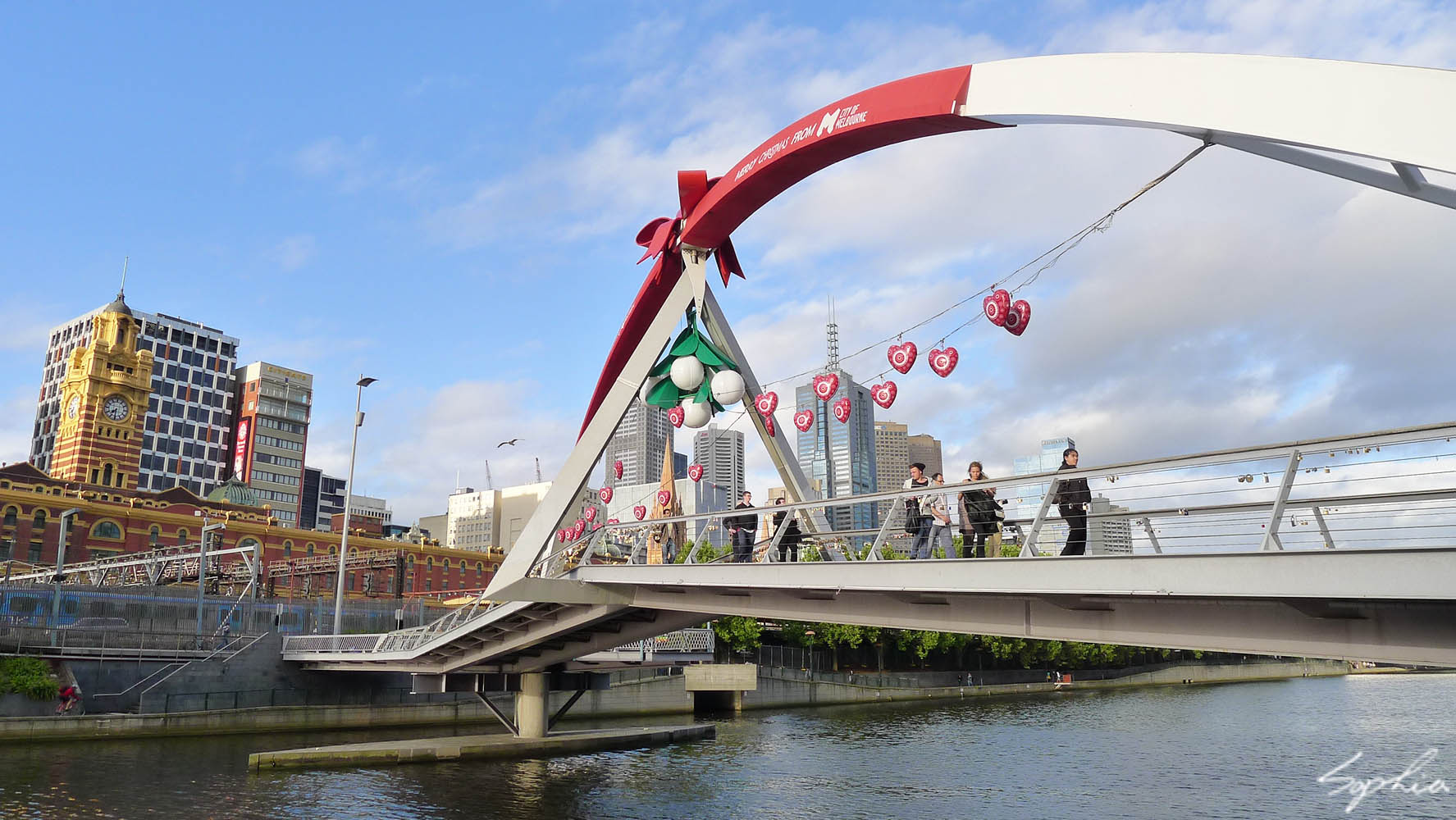 斜斜穿過亞拉河的南岸人行橋,在拱形結構下流出一個寬敞的小廣場空間,供人停留、照相,是個很不錯的觀光景點。應該是因應節慶的關係,拱形結構上頭綁了紅色的緞帶,襯托著白色的橋體,非常漂亮。