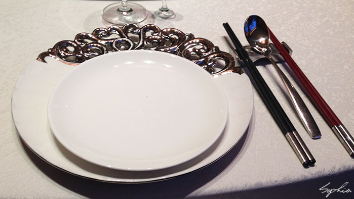墊在小盤子下的大盤子有銀色縷空雕花,挺漂亮的,不過接食物屑屑的功能可能就沒那麼好了。