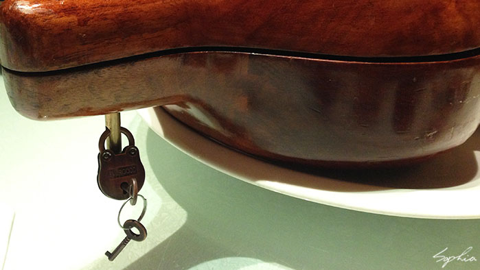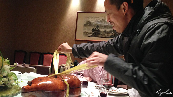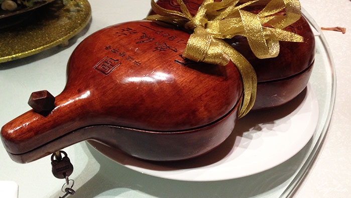 我們現在所看到的葫蘆雞,可能是因為是拿來招待領導、外賓用的吧,所以更加大費周章,還用真的葫蘆裝起來,煞有其事。葫蘆嘴上了鎖,葫蘆身綁了緞帶,服務生解釋完葫蘆雞的緣由,請來賓開鎖、解緞帶,嘴裡還碎念了一大串的祝福的話,而被當作貴賓的真先生則負責開鎖、解緞帶,笑得合不攏嘴。