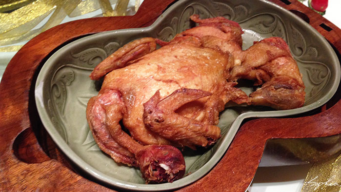 葫蘆打開,看到裸體的葫蘆雞。服務生讓我們看到雞之後,便拿到旁邊去切成小塊,方便我們分食。雖然看起來很乾,但是這葫蘆雞真是好吃。酥脆的外皮,肉質軟嫩,且非常入味,是個很不錯的雞肉料理。