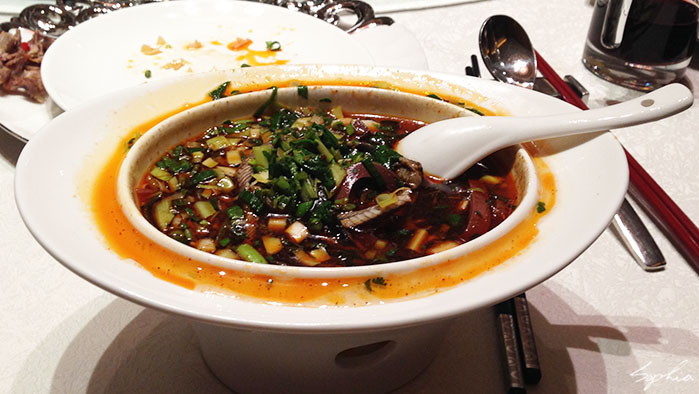 不太記得 (也查不到) 這道菜叫什麼,不過好像跟血盆羊肉長得有點像,只不過裡面放的大多是鴨血而不是羊肉,就姑且叫它血盆鴨血吧。不過我沒吃過血盆羊肉,這樣講好像挺不負責任。總之,這是一道很合我胃口的菜,酸酸辣辣的湯裡頭有不少香料,有可能是清真料理,是個會讓人一口接一口一直喝一直吃的湯品。誰告訴我這是什麼啊?