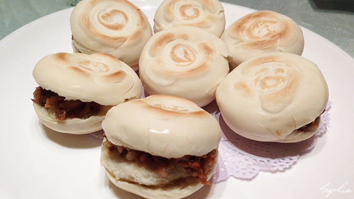 一般的肉夾饃大概有巴掌大,吃一個就飽了。西安飯庄把肉夾饃變成迷你版,讓大家嚐嚐味道即可。我之前吃過一般的肉夾饃,只記得餅皮很粗,咬起來很辛苦,是個我不會沒事想要買來吃的小吃。我本來幻想是類似在台灣吃到的牛肉夾餅咧。