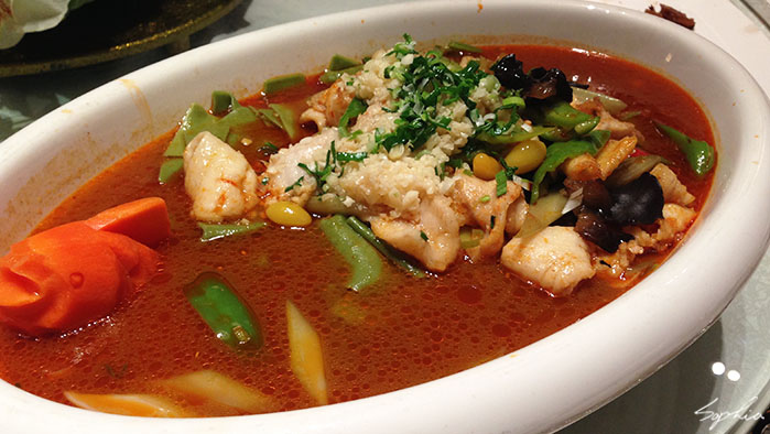 又來了一道我覺得好好吃,但是不知道是什麼名字的料理。這道菜是魚,辣辣的口味吃起來有點像水煮魚。魚下頭鋪了涼粉跟Biang Biang麵。Biang這個字其實有中文,不過筆畫很多,非常難寫,我也打不出來,所以就打英文咯。Biang Biang麵的名稱有許多說法,有人說是揉麵時發出的Biang Biang聲,有人說是麵下鍋時的聲音,也有人說是嚼著麵發出的聲音。