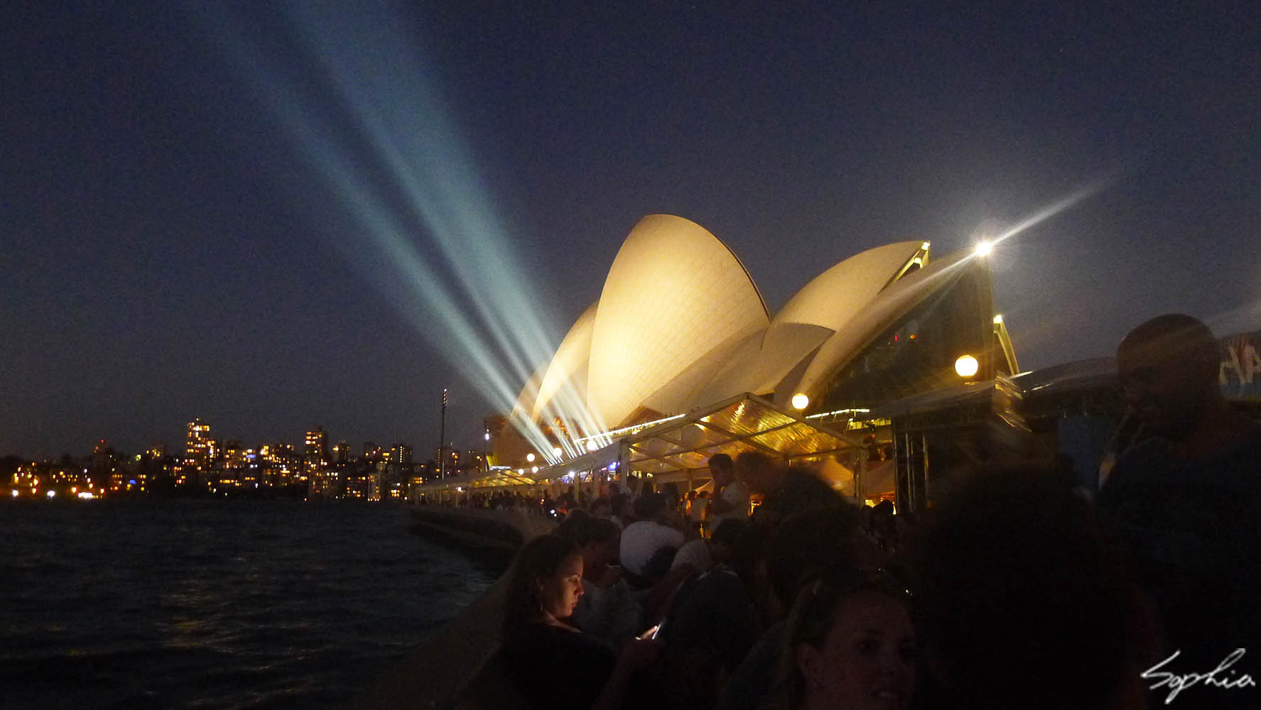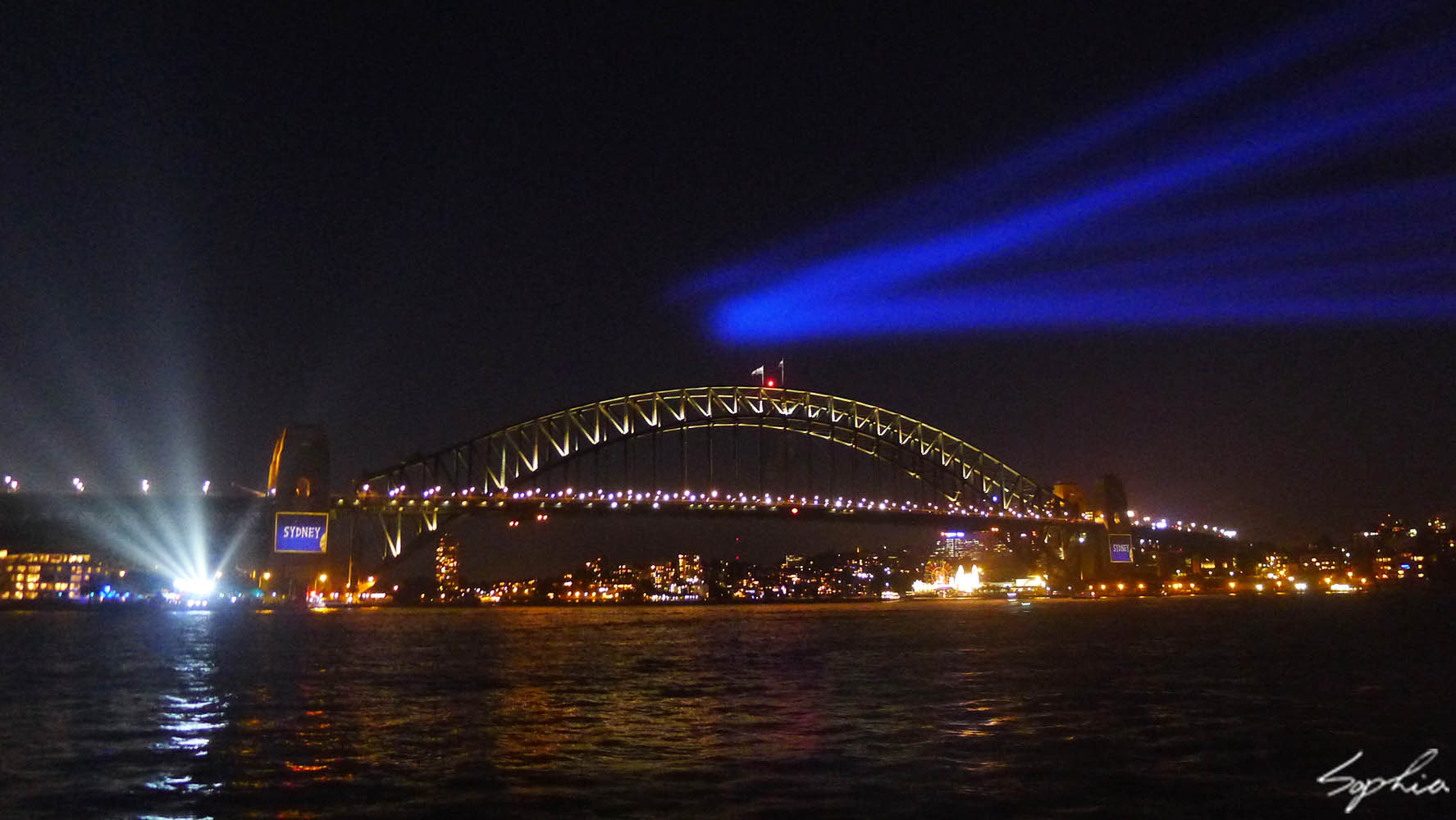 現在看到的出現在空中的藍光,是從歌劇院這一頭射出去的。好強烈的光,都快要打到港灣大橋了。「蝙蝠燈大概就是這樣吧。」我說。小克開心的連點了好幾次頭。小克是蝙蝠俠迷,所以我還沒說之前,他早就想到蝙蝠燈了。