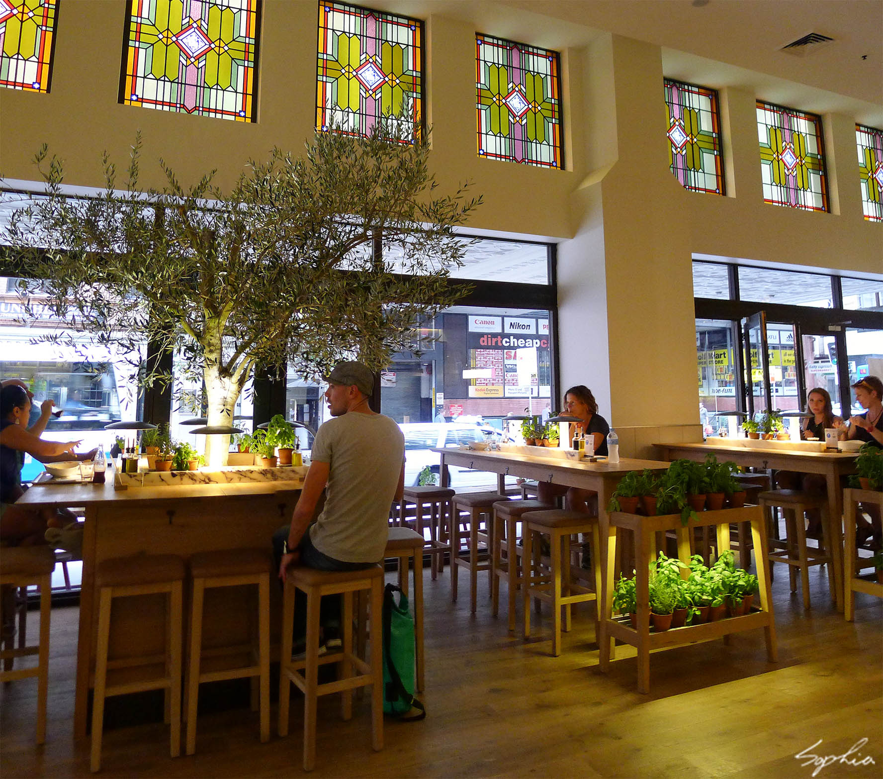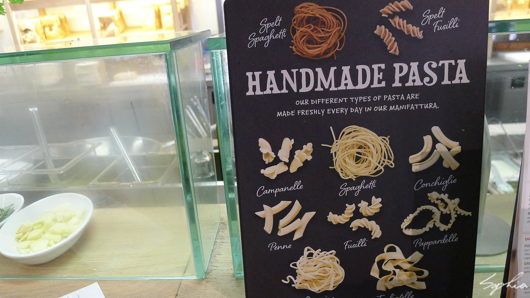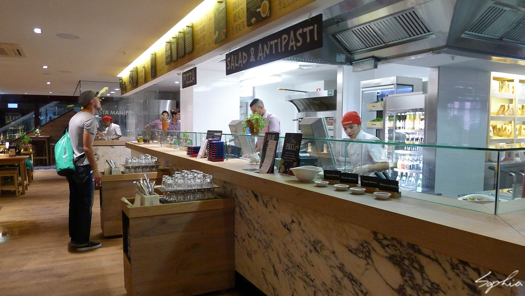感覺有點像是速食的三明治店的自助方式,不過這裡的披薩、義大利麵都是店內自制的,食材也多是有機材料,所以依舊屬於高檔一些、等級好一點的的平價料理。開放式廚房可以讓人看到食物的製作跟調理方式,怎麼在披薩上面鋪設材料,或是如何拌炒義大利麵、加入調味料,一切清清楚楚,所以製作時的步驟跟廚房衛生都得一絲不苟才行。