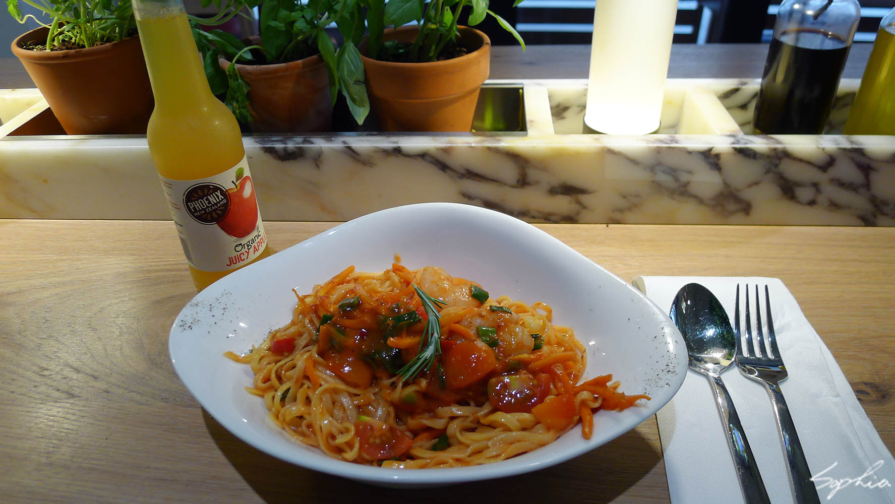 小克點了一份披薩,我則點了一份海鮮番茄義大利麵。點餐時,工作人員詢問要加什麼調味料 (可以自己選),我說了不要起司後,訓練有素的她馬上了解我不能吃乳製品,所以很小心的把所有相關的乳製品調味料都去除了。