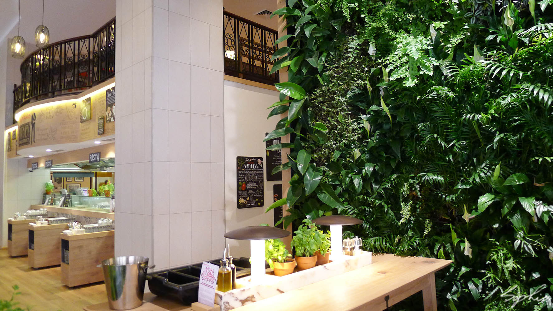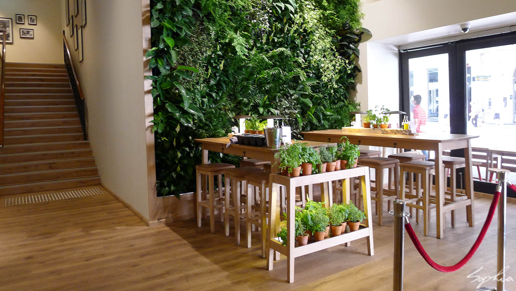 高挑明亮的空間、漂亮的彩色琉璃窗、有著清新氣息的木質地板跟桌椅、細緻的鑄鐵欄杆、工業風的造型燈飾,以及小樹、香草盆栽跟綠牆所帶來的滿滿綠意,這一切都讓Vapiano成為充滿空氣感的餐廳,讓人覺得像在漂亮的溫室裡頭吃飯一樣,好清新,好舒服。