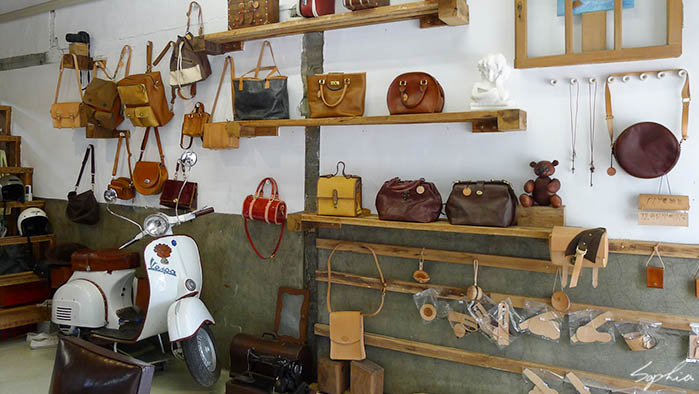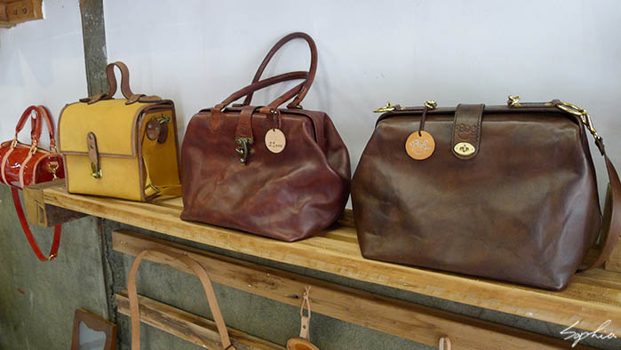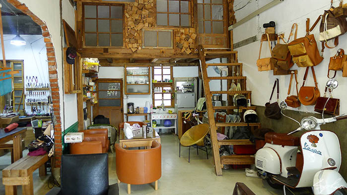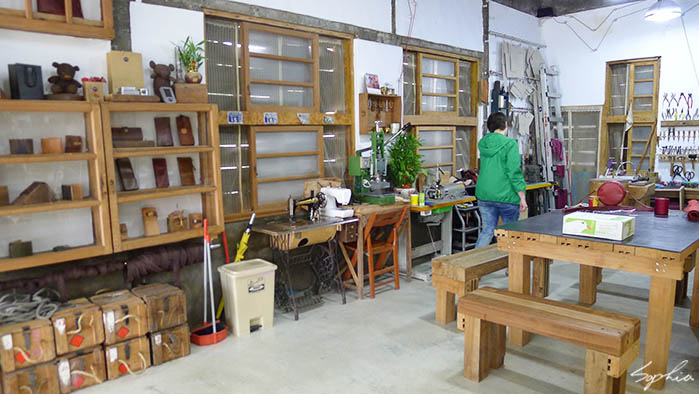 泛著濃厚皮革味道的工作室,裡頭展示了不少皮革製作材料跟工具,也有可直接販賣的成品,從皮夾、鑰匙包等小皮件,到女生提包、背包等大型皮件都有。