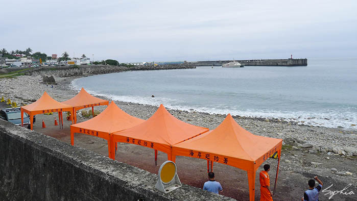 漁港旁有一排顯眼的拉膜構造物,是給等候登上渡輪的人遮蔭用的。
