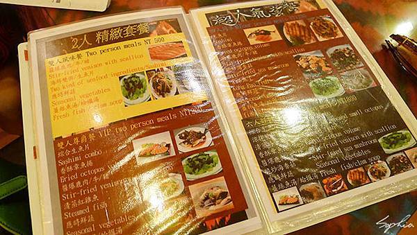 二人精緻套餐有醬爆鹿肉(也可選牛肉或豬肉)、海鮮雙拼(也可選生魚片)、炒時蔬、薑絲魚湯 (或蛤蠣湯)。三菜一湯,兩人吃剛剛好。