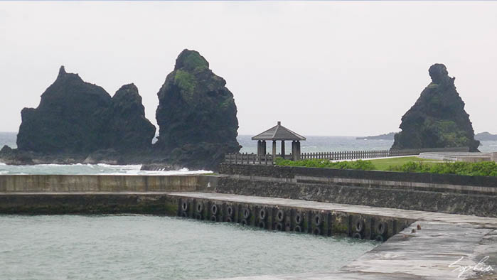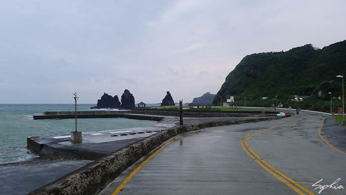 才騎了沒多久,我們抵達將軍岩了。綠島原名火燒島,是火山集塊岩構成的島嶼,島的四周為裙狀珊瑚礁,也因此,沿著海岸線可以看到不少有奇形怪狀的礁岩,將軍岩就是其中一個。你看,那個在右手邊的岩石,是不是很像正在低頭讀兵書的將軍? 前方兩個大概是他的嘍囉,等著隨時供將軍使喚吧。