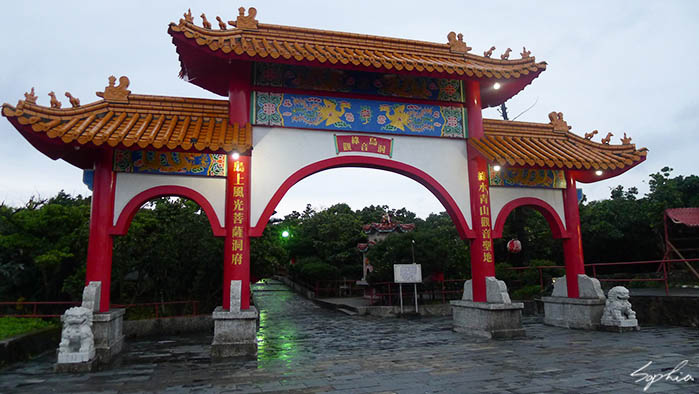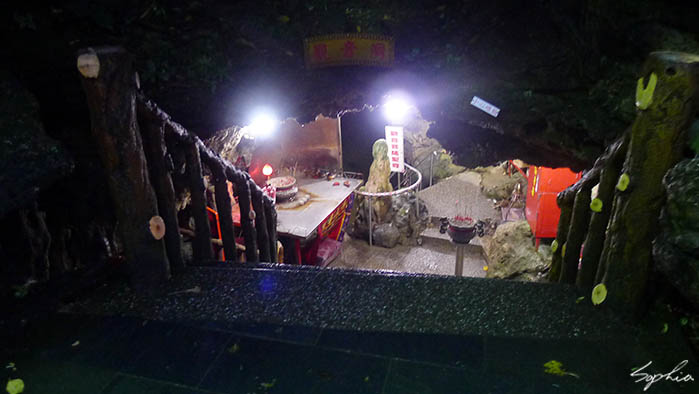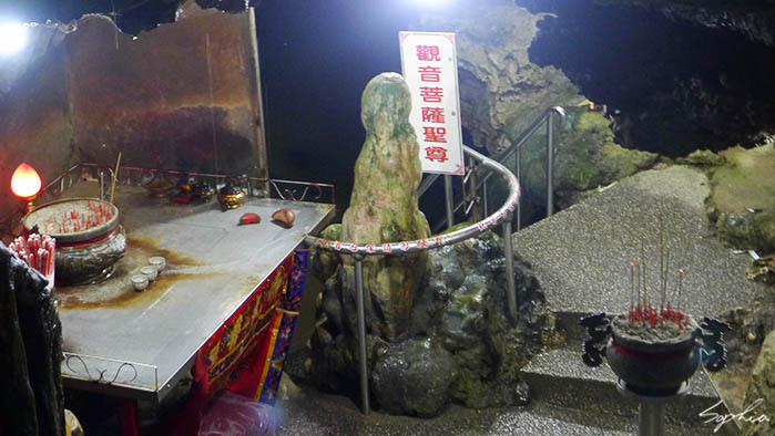 穿過牌樓,走沒幾步路,即可到觀音洞。鐘乳石洞中有個石筍,狀似觀音,所以被稱為觀音洞。觀音洞有不少聖徒到此朝聖,香火鼎盛。觀音的旁邊有個階梯,可以走到裡頭去看鐘乳石。不過下了一整天的雨,進入觀音洞的階梯非常潮濕,看起來很滑的樣子,所以我們沒有下去,只是站在上面拍照而已。