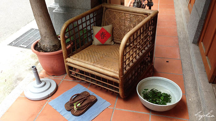 一走到這,還沒進去店面,我在走廊看到一個好像在鄉下阿公家看過的藤椅,前頭擺著木拖鞋跟洗腳水,讓我好想坐下來,泡泡腳。