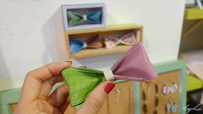 我在這裡看到一個皮質的蝴蝶結。本來很小女生很柔性的蝴蝶結,以皮質製作後非常硬挺,衝突感很有趣。