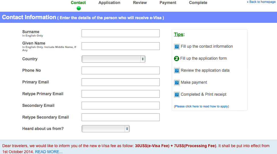 1. 首先,進入https://www.evisa.gov.kh/ContactInformation.aspx,會看到這個畫面。表格只有英文,沒有中文,不過需要填的東西都很簡單。想到異國自助旅行的人,英文大多有一定的程度。如果連這樣的東西都無法想辦法填寫的話,親愛的,你不適合自助旅行。