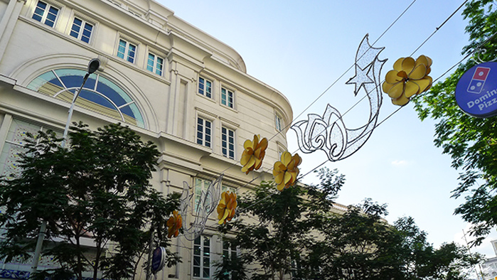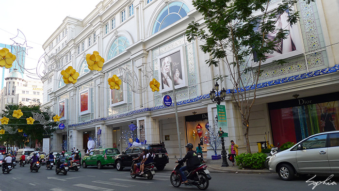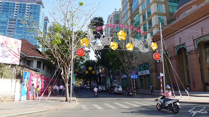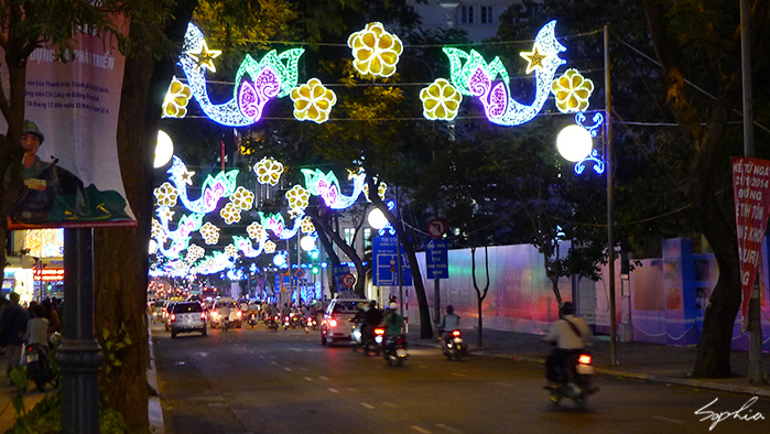 從西貢聖母聖殿主教座堂的正門往東走,經過教堂前方的小花園與聖母像,與其正對的馬路就是同起街。同起街的街道不是很寬,是個尺度較親切的林蔭道路,而這條著名購物街道在聖誕新年假期期間架起了一排排的花燈,讓它好好迎接到此朝聖的遊客們。