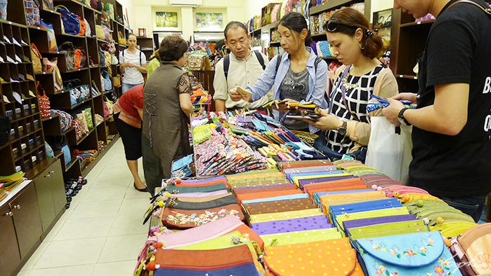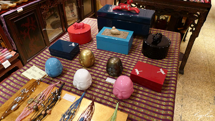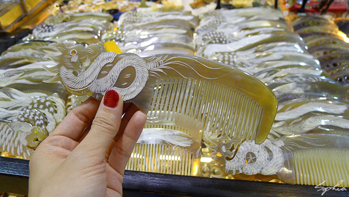 在同起街逛了幾間店後,會發現有不少紀念品店賣的東西大同小異,比如在Ombo所看到的棉質小包,或是我在夜市買到的圓滾滾帶蓋小碗,或是現在看到的象牙梳子或髮飾等。商品的價錢各異,所以建議多比價再決定。