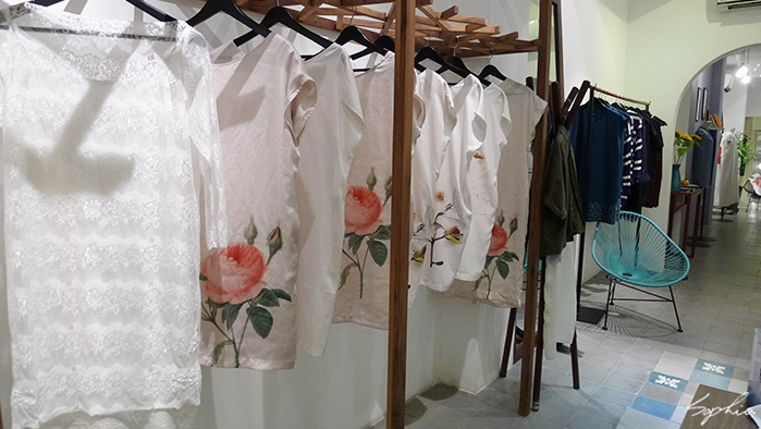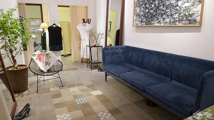 Lam的室內裝璜如同店面外觀一樣,以白色牆面打底,加上湖水藍的特色牆面跟設計師座椅,藍色拼花地磚,讓空間呈現清新清爽的氣質。Lam的衣服也有同樣的感覺。Lam是越南當地設計師品牌,這裡的衣服大多採用很簡單的顏色組成,有不少白色或是黑色的洋裝,加上水墨畫風的圖樣,是帶著東洋色彩,淡雅中有著某種引人注意特質的衣服。