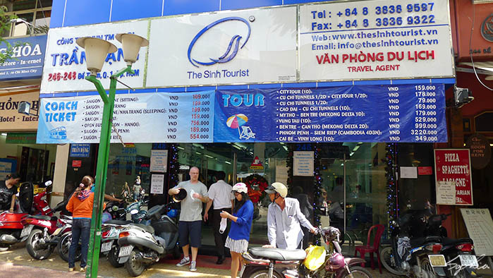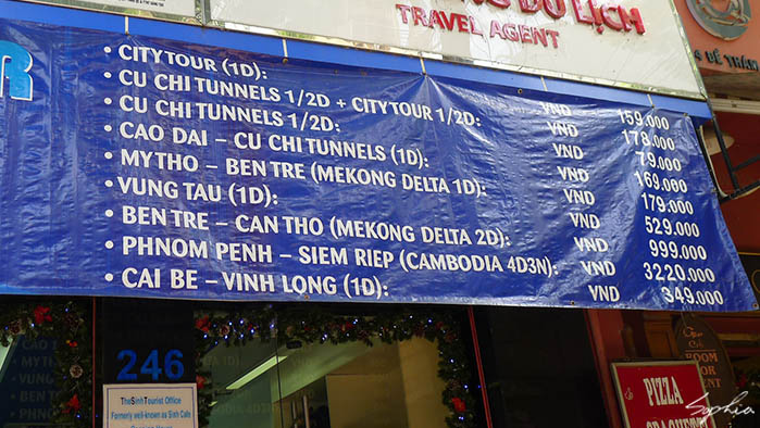 走在胡志明市第一郡的范老五街區,會在路邊看到很多小旅行社,出售各式各樣的一日遊套裝行程。這些旅行社都有著類似的外表,小小的店面,面對街頭的櫃檯,以及貼滿牆面的景點照片跟寫著套裝行程名字跟價位的海報。有些背包客旅館的門口也會放寫著套裝行程價格的海報或是小黑板。洗衣店也有。我曾看到某間位在街角的小小洗衣店,裡頭也擺了套裝行程的海報。不確定是洗衣店兼賣套裝行程,或是旅行社兼做自助洗衣就是了。那麼,要找哪一家買套裝行程呢? 我選擇的是 The Shin Tourist。