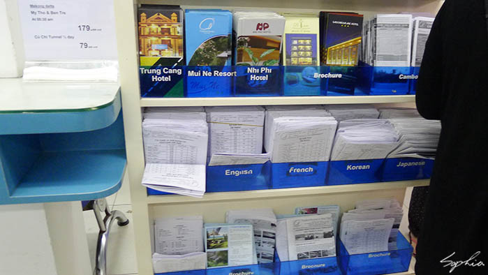 進入The Shin Tourist,可以看到兩個主要區域。一個是位在左邊的服務櫃檯區,一個則是候車區。服務櫃檯前有個架子,上頭有不少旅遊資訊,可以自由拿取。