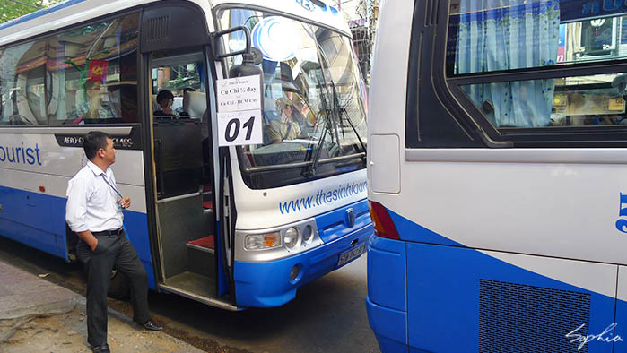 巴士有小巴跟大巴,看參加行程的人數多寡來決定。每個行程都有導遊,會簡介景點之類的。導遊的素質不一,比如我參加古芝隧道所遇到的導遊,似乎帶團帶太多所以變懶了 (他自己也有這樣說),很多時候都讓我們看其他導遊在介紹,自己則在旁邊發呆。我參加湄公河一日遊的導遊就不錯,介紹得很詳細,也會主動跟遊客聊天,並回答問題。那位導遊的英文很好,所以不會有不知所云的狀況發生。