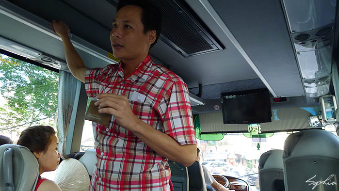 出發時間到了,我們的巴士也在一片混亂中到達。參加這個一日遊的遊客一一上車,導遊確認遊客人數後,隨即出發。導遊是個越南大叔,英文夾帶濃濃的越南腔,不過溝通或是解說倒是沒問題。導遊上車後,簡單介紹了今天的行程,然後跟大家收取古芝隧道的入場費,之後便放大家自行休憩打盹。從胡志明市中心到古芝隧道要一個半小時的時間,可以好好補個眠。