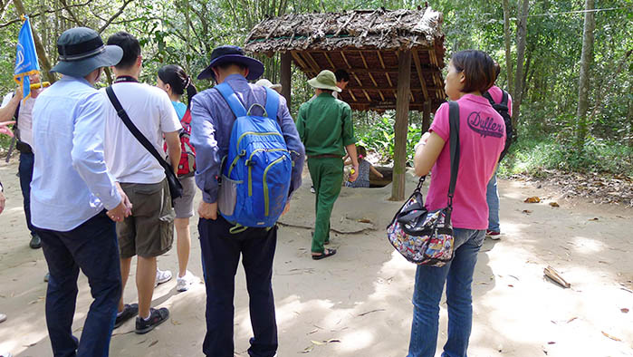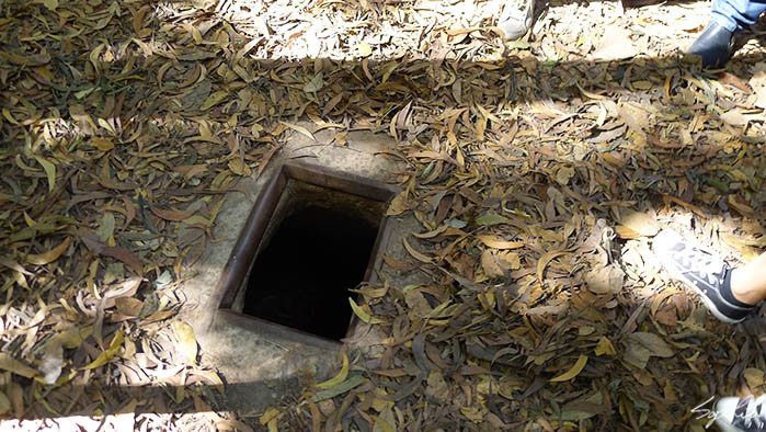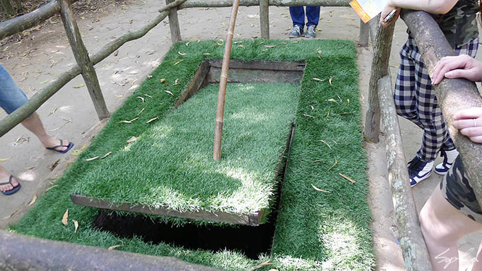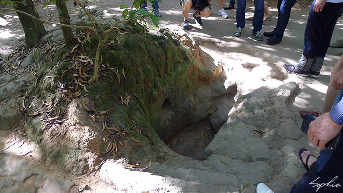 園區是個森林,走在裡頭,不時可以看到觀光客聚集的地方,就是當初越軍挖鑿的隧道出口或是機關。比如現在看到的這個小洞,是某個隧道的出口。小洞非常非常窄,只有瘦小的越軍能鑽進去。高大肥壯的美軍可能只能把腳塞進去而已,屁股進不去。不過現場有不少外國人為了證明自己的纖細,多半會鑽進去試試看。下半身進入洞中後,他們得把手抬高,縮小肩膀寬度,才有可能讓整個身子蹲下去。