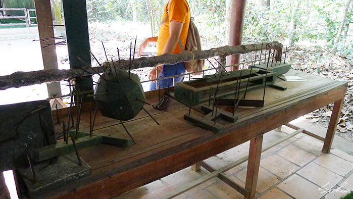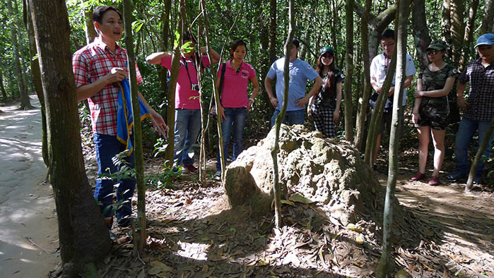 走在森林裡,導遊停了下來,站在一個土堆旁,叫我們猜這是什麼東西。誒....土堆啊。我怎麼知道是什麼東西? 其實這個土堆是通氣孔。越軍所挖的隧道,不僅是交通用的通道而已,還是他們的生活場所,裡頭有廚房有臥室還有醫療室。畢竟戰爭時期,都得躲在隧道裡突襲敵軍了,應該沒辦法在在地面上蓋個村子生活吧。應該馬上就被炸掉了。