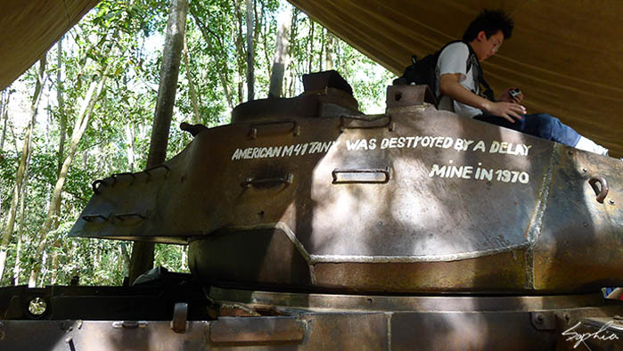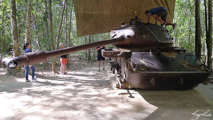 園區中有個重樣級的坦克車,是美軍坦克車,當年被地雷炸到而損毀,然後留在這裡的。本來負著重大的使命,在異鄉打拼的坦克,現在長滿了鐵鏽,遺留在胡志明市的古芝森林中,成為遊客爬上爬下拍照用的布景。