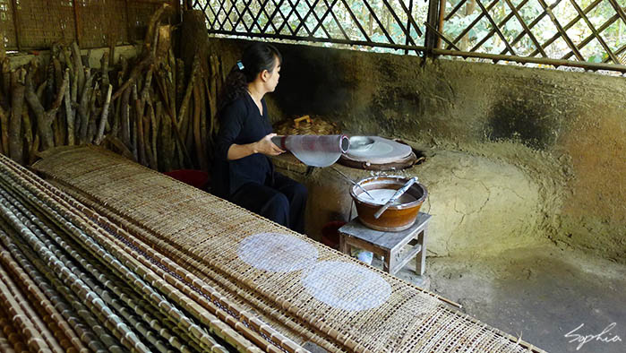我們也在某個茅草房看到越南春卷皮的製作方式。原來春捲皮是這樣製作的。首先把米磨成米漿,然後將米漿均勻倒在一個發燙的圓形檯面上,蓋上蓋子,讓米漿皮在裡頭蒸一下,然後就可以把米漿皮拿起來,放到一旁晾乾。這樣就做成春捲皮了。有點像可麗餅的製作方式。