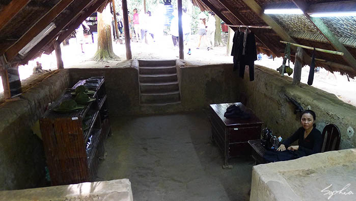 古芝隧道園區中有不少展示區,許多展示區像下面這張照片一樣,是個茅草搭的低矮棚子,棚子下方則是凹陷的空間,裡頭展示著越戰時期使用的彈藥、服飾等,擺著假人模擬當時的狀況。