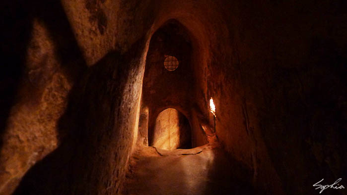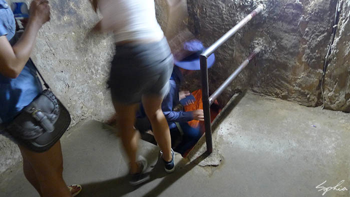 小亭子下頭有個平台,從這裡下去有個洞口,那裡才是真正的隧道入口。大家一個一個扶著牆面,往隧道裡走。不過,才下去幾個人,隊伍便停了下來。過沒多久,有個小女孩爬了出來,跟著一個像是她爸爸的人。「發生什麼事嗎?」站在我身後的外國女子問。他們沒有回答,我們只好聳聳肩,繼續一個一個跳進隧道裡。