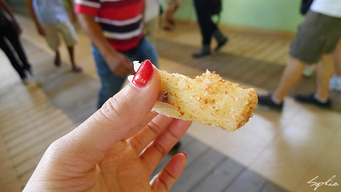路邊還出現了賣水果、小零食的攤販。某位團員買了某種在地小吃,分給大家吃。這個小吃叫做khoai mi,以煮過的木薯沾了芝麻、糖粉、椰奶製成,是個很簡單但是又挺有風味的小吃。吃起來口味不錯。