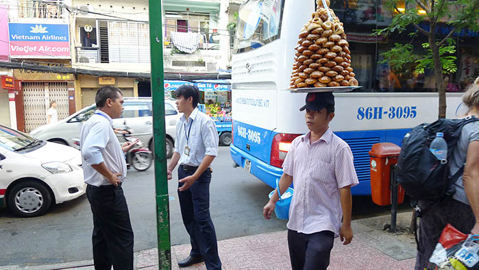 正在懊悔沒有買越南三明治的時候,眼前出現一個很有趣的人。穿著襯衫跟長褲,很像在辦公室裡頭工作的大叔,帶著鴨舌帽,頭頂大圓盤,圓盤上頭堆疊了十幾層的麵包 (應該有一百顆麵包在上頭吧),麵包塔的頂端還有個夾子。大叔挺著身子,以堅定且穩定的腳步走著,眼神則一直左顧右盼,確認擁擠的人行道上的過客,以免撞到他們。大叔到底是要送麵包到哪個店裡,還是他是在賣麵包,只要跟他揮揮手就會停下來,拿起夾子遞一塊麵包過來呢? 只可惜麵包大叔沒有在我面前停下來。且即使他停下來,我也不確定有沒有辦法跟他溝通,而大叔瞄了我一眼,繼續以穩定的腳步前進,消失在人群中。