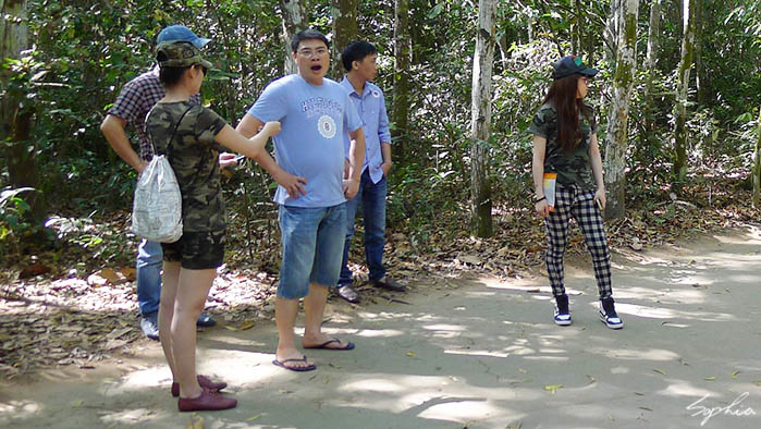 對了,參觀古芝隧道時需要在森林中走動,還得在隧道裡爬,所以建議遊客穿著輕便且不怕髒的衣服。我們這一團有兩個妹妹,很有計劃性的穿了迷彩服來,試圖融入環境以及場景,非常用心。 反觀我,只是穿著條紋T-shirt跟短褲,似乎遜色了。哎喲,總之,輕便好活動的衣服就是了。