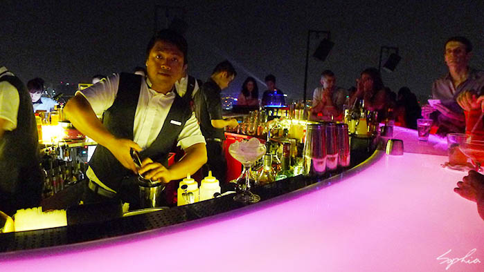 吧台裡的調酒師有好幾個,他們站在圓圈圈吧台中,非常忙碌的調製各式各樣的雞尾酒。這裡的調酒師的態度挺不錯的,會不時注意吧台邊的客人,幫他們點單調酒,不會裝酷裝忙裝沒看到。