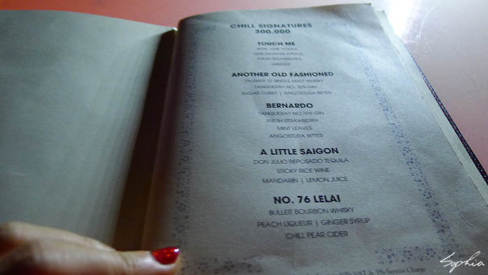 Chill Bar是屬於比較高檔的雞尾酒酒吧,裡頭的酒的價位也比較高,比如我點的特色雞尾酒是300,000盾,差不多等於港幣110元,外加一成服務費,跟香港或是紐約等大城市的調酒相等價位。其實我覺得這個價位比香港的高級雞尾酒吧便宜一些。若以香港ICC裡頭的Ozone來說好了,它同樣是高檔的屋頂酒吧,裡頭的調酒就要一百五到兩百元港幣左右,還要加上服務費,所以隨隨便便就超過兩百元港幣了。不過,畢竟這裡是越南,吃一頓飯只要二十元港幣就可以吃很飽了,所以Chill Bar還是相對昂貴的地方。
