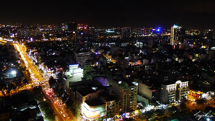 胡志明市區有幾條花園大道,比如我們眼前看到的黎利街 (Le Loi) 和咸宜大道 (Ham Nghi),這些寬敞的花園大道有不少車流量,車燈配上街燈,還有因應節慶架設的花燈,讓這些街道變成一條條漂亮的光帶,好像銀河一樣綿延到遠方。真是漂亮。