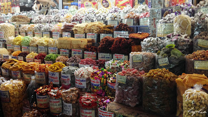 各種顏色各種顆粒各種味道的乾貨堆滿了整個攤販的牆面,形成一個視覺跟味覺都很有意思的組合。只不過我不太愛吃這種類型的零食,什麼芒果乾啊堅果啊梅子啊,我都沒太大興趣,所以對於眼前的誘人畫面,我只想要摸一下聞一下,沒有購買的意思,而這裡的攤販一直虎視眈眈地看著靠過來的客人,會馬上招呼並起拿起塑膠袋跟磅秤,所以我只能遠遠地拍照,做個紀念。