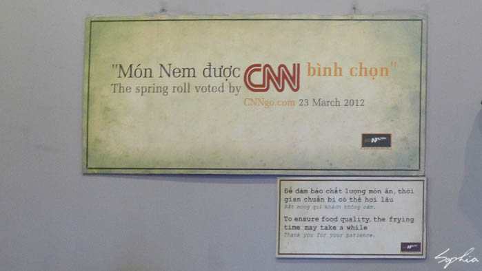 Quan Nem這間店來自河內,招牌菜是河內的著名餐點炸蟹肉春卷。Quan Nem的炸蟹肉春卷似乎很有名氣,還曾被CNN選為河內十大街頭食物之一呢。