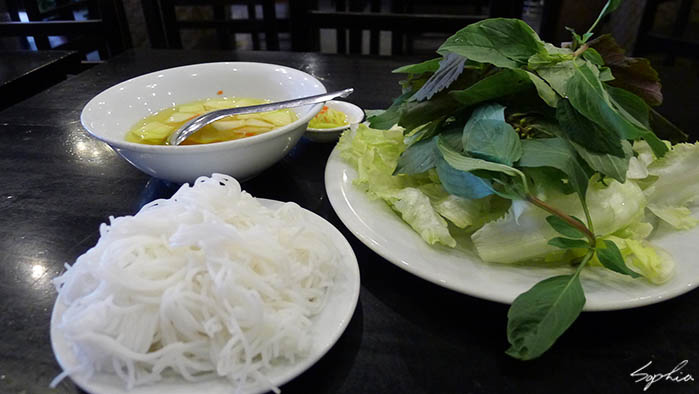 去除點蟹肉春卷外,我還點了一份越南米線,所以點餐完沒多久,服務生便送上一大碗米線,以及搭配米線的生菜,以及魚露醬汁。