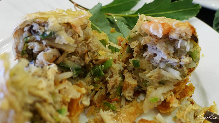 從春卷的斷面圖可以看到裡頭包了滿滿的蟹肉,還有香菇、豬肉、蛋、冬粉,是個非常扎實,且散發著濃厚香味的春卷。