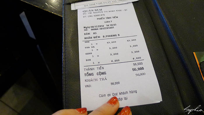 份量十足的蟹肉春卷,只要43,000盾 (大約港幣16元),加上米線跟飲料,這餐只花了我56,000盾 (大約港幣20元),真是便宜。